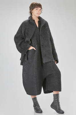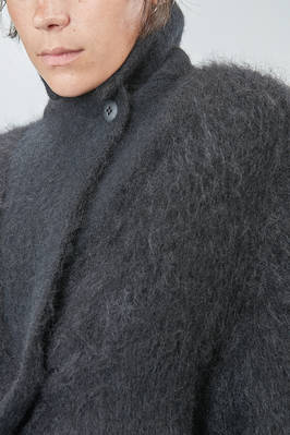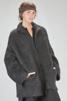 long and oversize caban, in brushed faux fur wool, mohair, nylon, yak and elastan knit, double chest with revers, closure with hidden buttons, vertical welt pockets on the front. The model is 178 cm. tall and she is wearing a size S