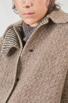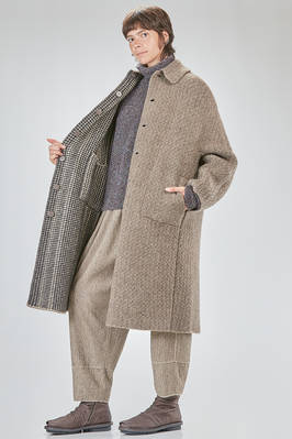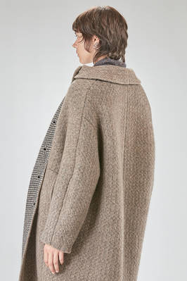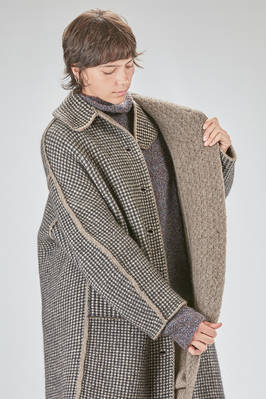 under the knee coat, wide, in double reversible wool, polyester, yak, mohair and elastan knit, on one side it has a melange shetland effect, on the other small bicolor and melange checks, one chest, shirt collar with flap that can be overlapped and be fastened with buttons, closure with hidden buttons, horizontal welt pockets on the sides and applied innerly, reversible. The model is 178 cm. tall and she is wearing a size S