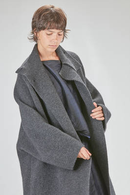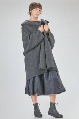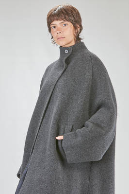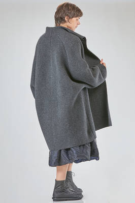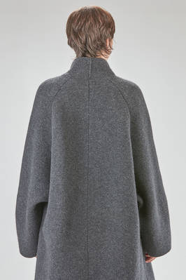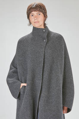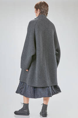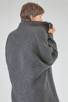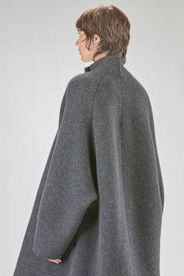 under the knee coat, wide, in double melange wool, yak, nylon and elastan knit, one chest with turtleneck, closure with lateral buttons on the nack, raglan shoulder, dropped wide sleeves, diagonal welt pockets on the sides. The model is 178 cm. tall and she is wearing a size S