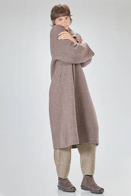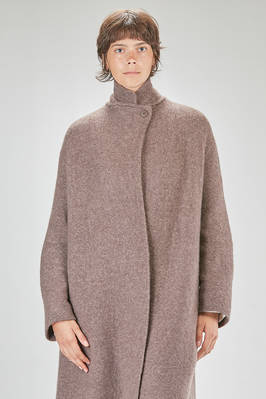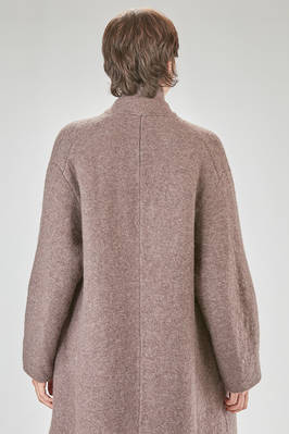 long and straight coat in soft melange cashmere, silk and polyester knit, one chest with barely noticeable revers, closure with one lateral button on the neck, vertical welt pockets on the sides. The model is 178 cm. tall and she is wearing a size S
