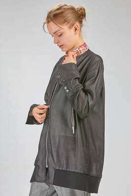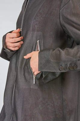 long and soft of English rib fabric of honey comb shape triacetate and polyester, lined with cupro, single breast, crew neck, cental vertical zipper closure, sleeve edge with buttons, diagonal front jetted pockets with zipper, bottom edge in rib knit. The model is 175 cm high and wears an italian size 42