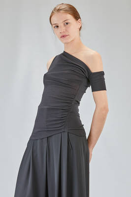 short t-shirt, lean and asymmetric, in mini-ribbed cotton and modal jersey, diagonal neckline on the front and on the back, one shoulder sleeveless and one with short band sleeve, light lateral drapery on the front, rounded bottom
