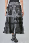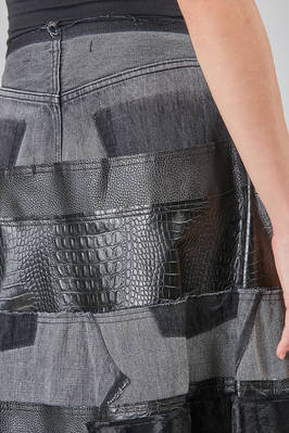 wheel-skirt 'sculpture' in stone wash cotton denim and patchwork of parts in snake eco-friendly leather and wool, nylon, cotton and polyurethane horse fur, built as dismantled and recomposed 5-pockets jeans, zip-closure with button, belt raw cut, print of the pockets on the back