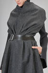 long cape coat in wool and nylon melton with some parts in leather-like polyurethanic resin, lined in cupro on the bust, one chest, round-neck, closure with pressure buttons and sewn belt on the waist, sleeveless with dropped shoulder, leather insert along the shoulder on the bag, folds sewn longly the belt, vertical welt pockets on the sides.