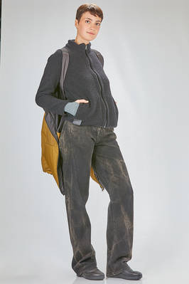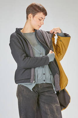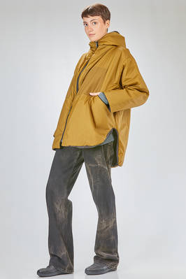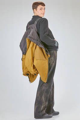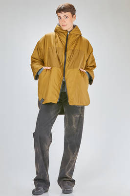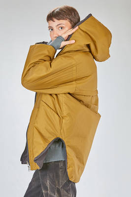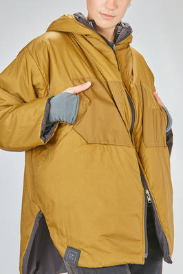 long and wide caban parka-style in water-repellent polyamide taffetas, padded in polyester wadding recycled from plastic bottles and inner gilet in polyester pile, one chest with hoof, zip-closure with double slider, vertical welt pockets on the front and diagonal welt pockets at the chest, cuffs with pressure buttons, removable inner gilet attached with lateral zips and buttons at the cuff, inner suspenders to wear it draped over the shoulders, high lateral slits, longer bottom on the back. The model is 180 cm. tall and she is wearing a size S