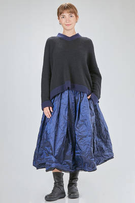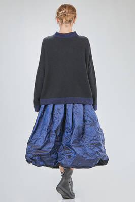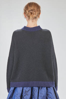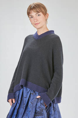 hip-length sweater, wide, in soft cashmere and silk knit with profiles in contrast of color, V-neck slightly rising, dropped long sleeves, slightly longer bottom on the sides. The model is 168 cm. tall and she is wearing a size I