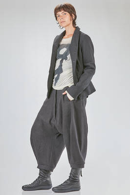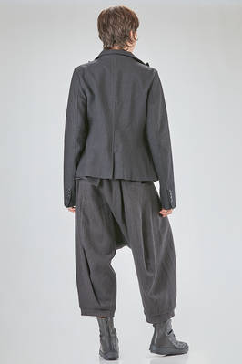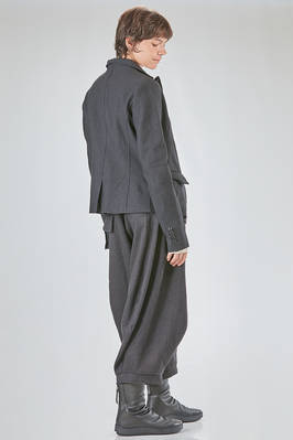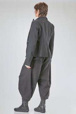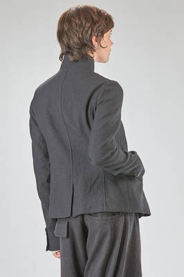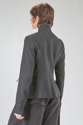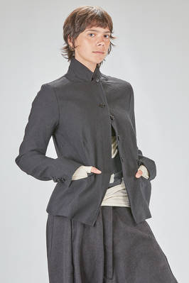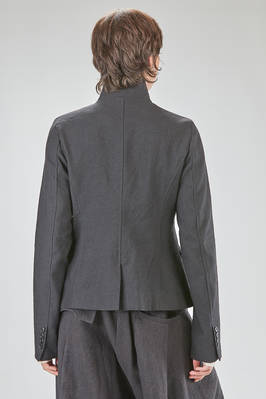 hip-lenght jacket, slightly slim, in linen and wool twill, one chest, band collar, closure with buttons, two pockets with flaps designed to look as if they have fallen inward into the pocket itself, rear central slit. The model is 178 cm. tall and she is wearing a size S