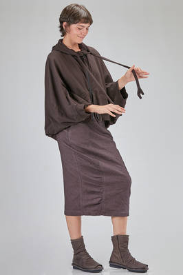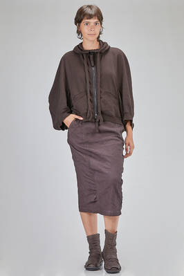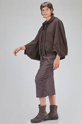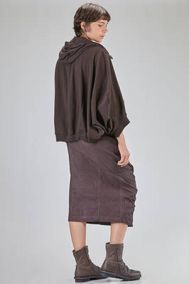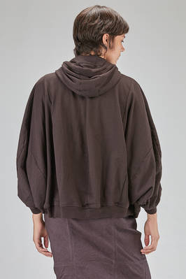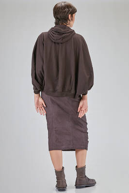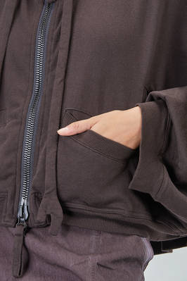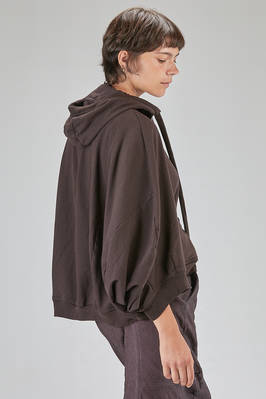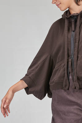 short and wide cardigan in cotton fleece, turtleneck with hood and long decorative extension with drawstring, zip-closure with double slider, wide cape sleeves, two pockets applied at the bottom. The model is 178 cm. tall and she is wearing a size S