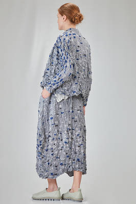 hip-lenght shirt-jacket, wide, in polyester froissé with horizontal striped alternated with gauzed stripes tone on tone and scattered cotton patches in various sizes and colors that give Impressionist painting effect, one chest, shirt collar, closure with pressure buttons, horizontal welt pockets at the bottom, irregular bottom, can be worn upside down. French sizes