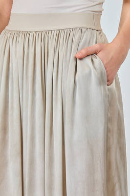long and wide skirt of overdyed silk and elatsan crêpe de chine, elastic waistband with tight curling, vertical side jetted pockets. The model is 180 cm high and wears a size M