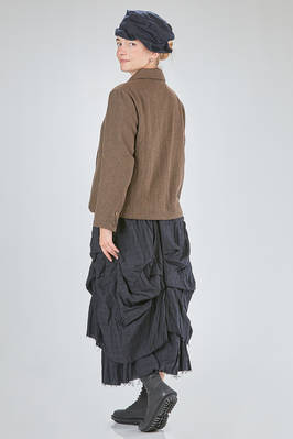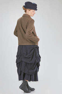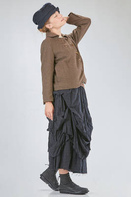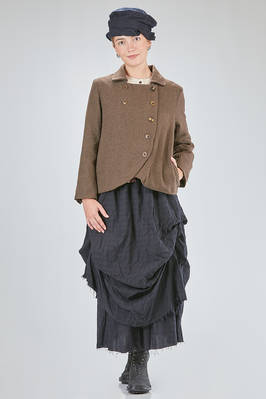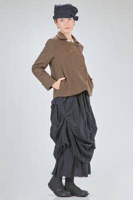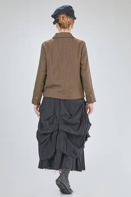 cappello a berretto asimmetrico in sallia di lana, foderato in tela di cotone, 3 anelli leggeri interni alla calotta e al fondo della parte con pannellino permettono di sistemarlo a piacere