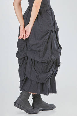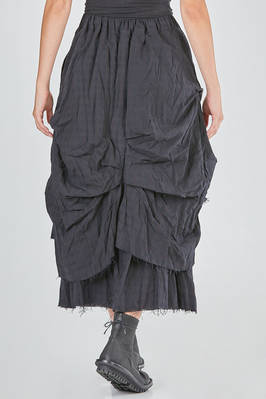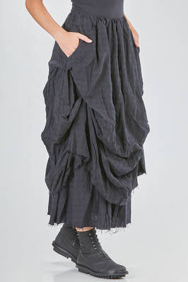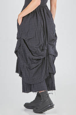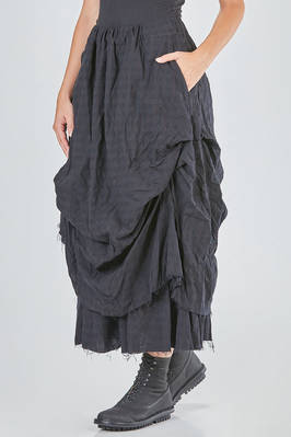 gonna lunga e ampia in twill di lana tutto doppiato con lavorazione a check tono su tono, foderata in tela di cotone, elastico in cintura, tasche a filo verticali ai lati, riprese irregolari della parte superiore su quella inferiore a drappeggi sparsi. La modella è alta cm. 167 e indossa la taglia I