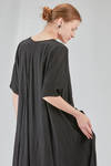 abito longuette, ampio e asimmetrico, in tela leggera e goffrata di viscosa e cotone, tutto foderato in tela lavata di cotone fino sotto al ginocchio, scollo a v con impunture lungo il perimetro, maniche corte scese e tagliate a vivo, cucitura con piccole pieghe rovesciate sul davanti, due tasche applicate, fondo irregolare e tagliato a vivo con piccolo spacco laterale sul davanti