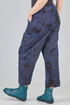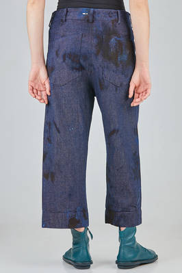 pantalone alla caviglia, ampio, in denim di cotone e lino sovratinto a mano con macchie sparse, vita alta con passanti per cintura, chiusura con zip e gancetto in argento, gancetto posteriore in cintura per stringerlo a piacere, tasche a filo diagonali sul davanti e due tasche applicate sul retro