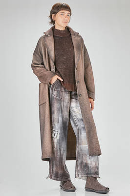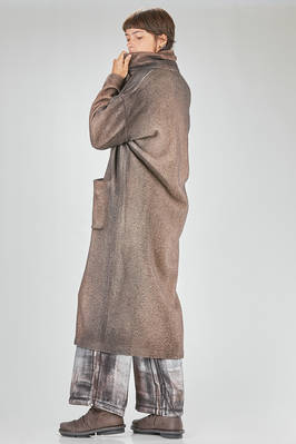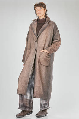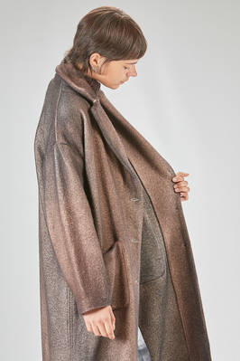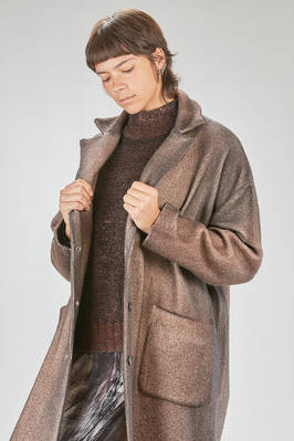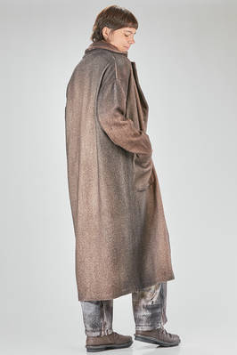 cappotto lungo e ampio in herringbone di lana vergine e poliammide sovratinto a mano tutto sfumato, un petto con rever, chisura con bottoni, due tasche applicate sul davanti. La modella è alta cm. 178 e indossa la taglia S