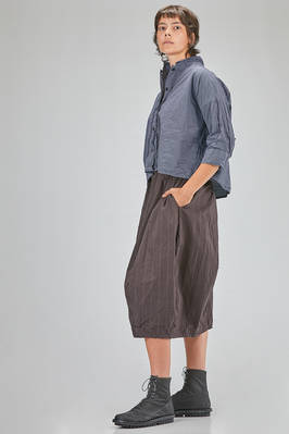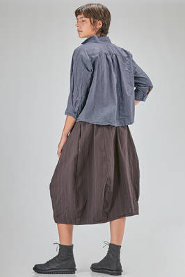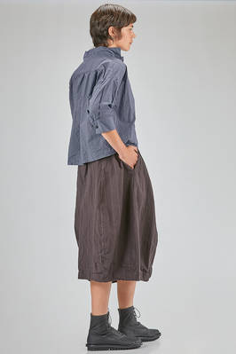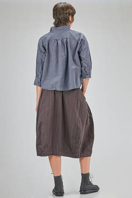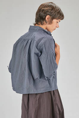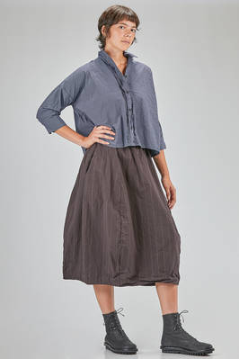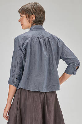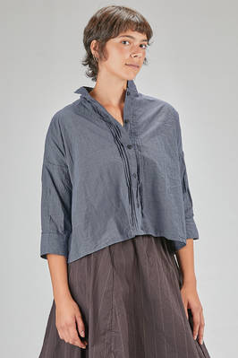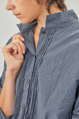 camicia corta e ampia, in popeline di cotone lavato con micro-check bicolori, piccolo collo a camicia, chiusura con bottoni, pieghe cucite verticali sul davanti, manica a ¾ con bottone al fondo. La modella è alta cm. 178 e indossa la taglia 42