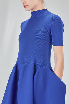 abito midi, voluminoso nella parte inferiore e asciutto nel corpetto, realizzato in maglia elastica di poliestere riciclato a costine verticali nella parte superiore e a texture orizzontali nella parte inferiore, completamente senza cuciture, collo montante, manica corta, pieghe geometriche ai lati della gonna. La forma dell'abito è definita a computer. La differenza, tra una taglia 1 e una taglia 3, è solo in lunghezza, di seguito le misure in cm: lunghezza 113.5/123.5 – lunghezza della manica 40.5/42.5