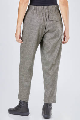 pantalone morbido in leggero e gradevole tweed pepe e sale di lana vergine, cachemire ed elastan, elastico in cintura, tasche a filo diagonali ai lati e una tasca con pattina applicata sul retro. La modella è alta cm 178 e indossa la taglia I