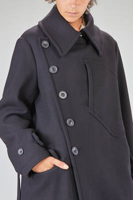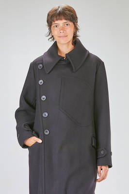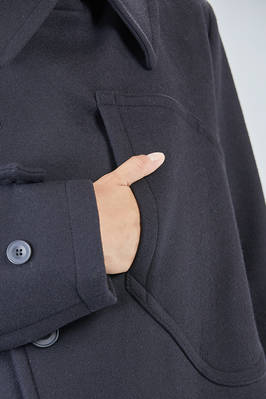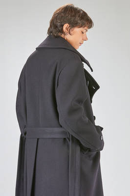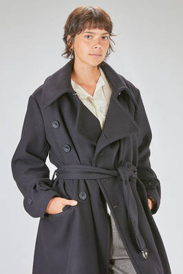 cappotto a trench lungo in panno di lana, poliammide e cachemire, doppio petto con ampi rever e grande collo a camicia montante, chiusura con bottoni e gancetto metallico al collo, martingala removibile e regolabile, una grande tasca applicata al petto, tasche con pattina sul davanti. La modella è alta cm 178 e indossa la taglia I