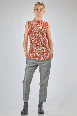 camicia al fianco, sfiancata, in chiffon di seta con stampa floreale astratta, collo a camicia, senza maniche, chiusura con bottoni. La modella è alta cm. 175 e indossa una taglia italiana 40