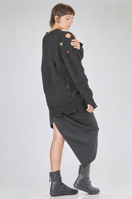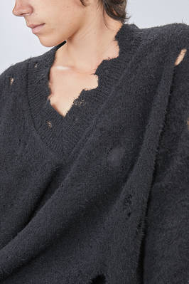 maglia lunga e ampia in maglia di lana e poliestere lavorata a rete e con consistenza tipo peluche, tutta traforata, profondo scollo a v con profili irregolari, manica lunga con parti traforate e polsini ad effetto maglieria consumata, tutta traforata ad effetto stramato, fondo irregolare e stramato. La modella è alta cm. 178 e indossa la taglia M