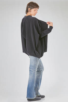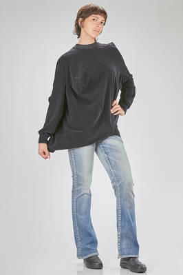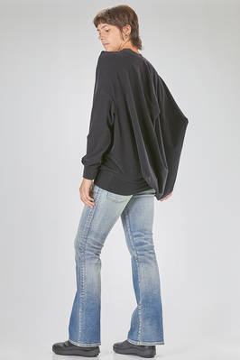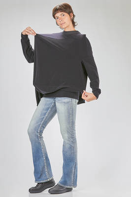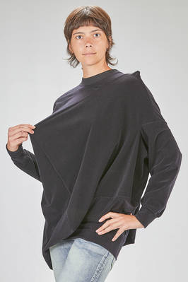 tunica 'sculpture' lunga in velluto stretch di nylon e poliuretano con colletto a costine di cotone, costruzione tutta asimmetrica con pieghe contrapposte e geometriche a cubo bidimensionale, girocollo, manica lunga ampia, fondo diagonale. La modella è alta cm. 178 e indossa la taglia M