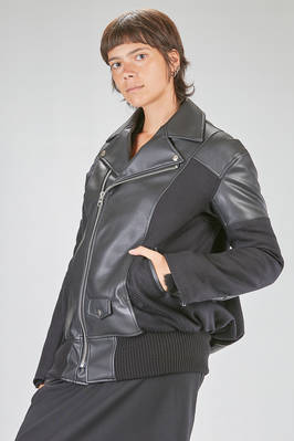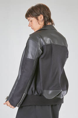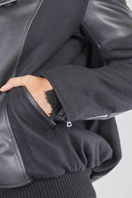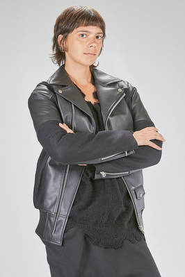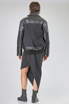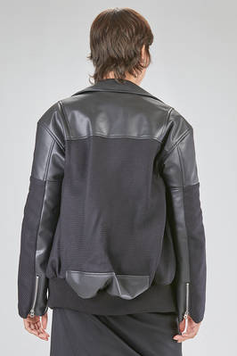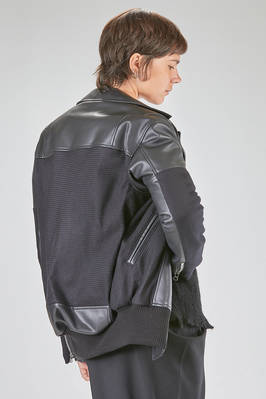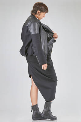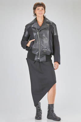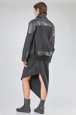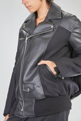 chiodo 'sculpture' lungo e asciutto in simil-pelle di poliuretano e parti in serge diagonale di lana e altre in maglia a costine di lana, doppio petto, rever con bottone a pressione, chiusura con zip, fondo manica con zip, due tasche a filo diagonali, un taschino con pattina e bottone a pressione al fondo, fondo in maglia a costine. La modella è alta cm. 178 e indossa la taglia M