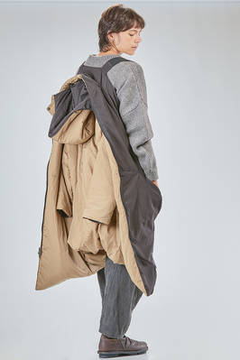 piumino sotto al ginocchio, ampio, in tela idrorepellente di poliammide con imbottitura in ovatta di poliestere riciclato da bottiglie di plastica, un petto con cappuccio applicato con bottoni a pressione, chiusura con zip con doppio cursore, due tasche a filo diagonali sul davanti, cintura removibile nello stesso tessuto, bretelle per essere sfilato e portato appeso alle spalle, tasche interne applicate, reversibile. La modella è alta cm 178 e indossa la taglia M