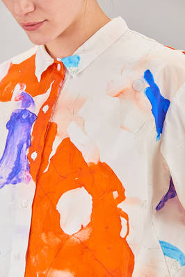 camicia al fianco, ampia e lievemente svasata, in popeline di cotone lavato e dipinto dall'artista francese Manon Gignoux, colletto a camicia, chiusura con bottoni fino al fondo, manica corta, fondo più lungo sul retro, spacchetti laterali
