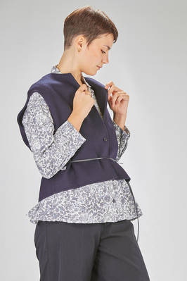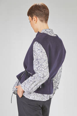 gilet corto e ampio in sallia a mano morbidissima di lana, poliestere e cachemire, cinturino sottile in pelle, un petto, girocollo, chiusura con bottoncino e cinturino, ideale da indossare sotto a cappotti leggeri. La modella è alta cm. 180 e indossa la taglia I