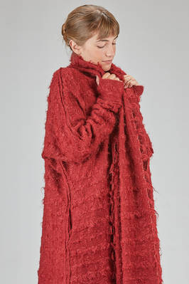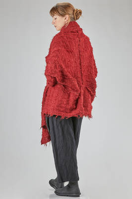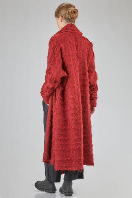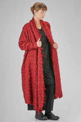 cardigan lungo e ampio a cappotto, in maglia bouclé con parti sfrangettate di yak, mohair e poliammide, ampio collo sciallato con spilla da balia, maniche molto lunghe con asola al fondo, tasche a filo verticali ai lati, fondo asimmetrico più lungo da un lato. La modella è alta cm. 167 e indossa una taglia francese 34 – da considerare come taglia unica