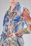 giacca al fianco, sfiancata, in georgette di seta con stampa a 'bouquet' astratto multicolor, un petto con piccoli rever, chiusura con bottoni, fondo manica con bottoni, due tasche con pattina, due spacchetti al fondo sul retro
