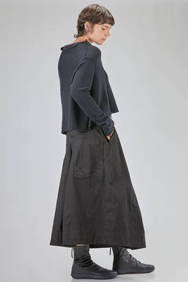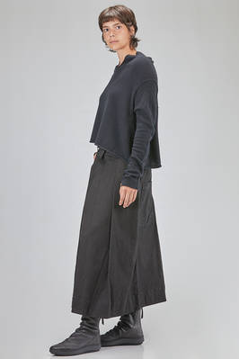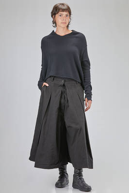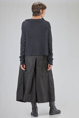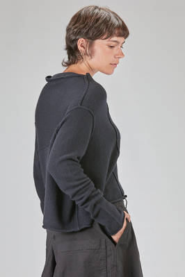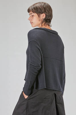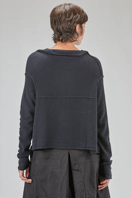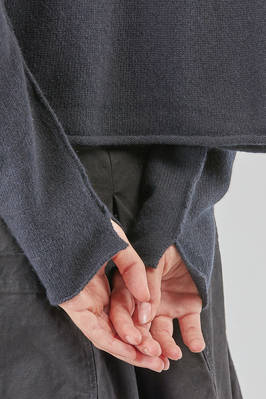 maglia corta e ampia in maglia morbidissima di cachemire e filo di zibellino, scollo a v montante sul retro con piccolo spacchetto laterale, manica lunga asciutta con spacchetto al fondo, cuciture esterne asimmetriche, fondo più lungo ai lati e sul retro. La modella è alta cm. 178 e indossa la taglia S