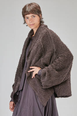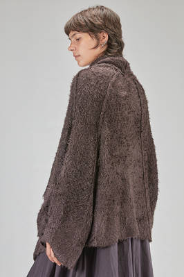 cardigan lungo e over, in maglia a filo lungo di seta morbidissima, collo sciallato, manica lunga scesa e ampia al fondo, chiusura con spilla da balia, cuciture esterne ad incrocio diagonale, due tasche al fondo, fondo diagonale e asimmetrico. La modella è alta cm. 178 e indossa la taglia S
