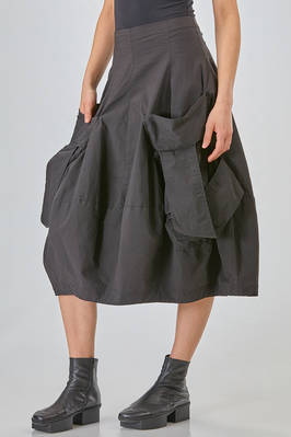 gonna sotto al ginocchio, linea a tulipano, in crêpe leggero con texture a ondine verticali di viscosa, poliammide, cotone, lino ed elastan, vita alta, bacino asciutto, grandi tasche applicate e bretelle applicate, tasche a filo verticali ai lati. La modella è alta cm 170 e indossa la taglia S