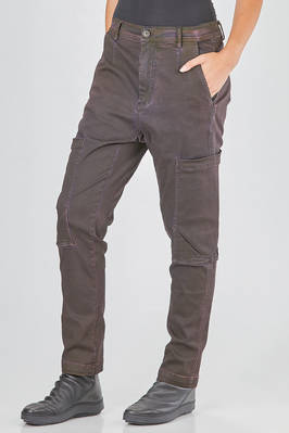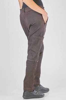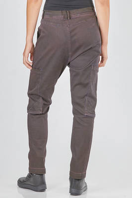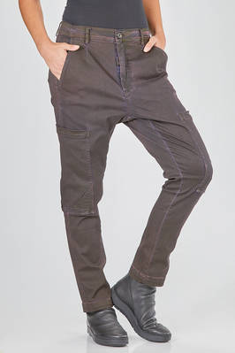 pantalone tipo jeans, asciutto, in denim sovra-tinto di cotone ed elastan, passanti per cintura, chiusura con zip e bottone, tasche a filo diagonali ai lati, grande tasca tasca applicata in laterale tra coscia e ginocchio. La modella è alta cm 178 e indossa la taglia S