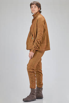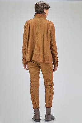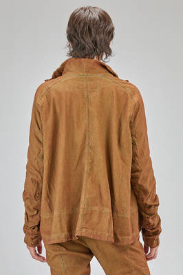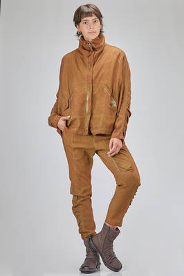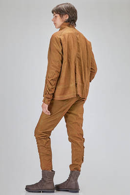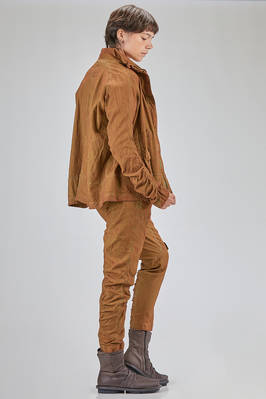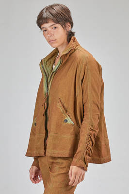 giacca/camicia al fianco, lievemente svasata, in denim sovratinto di cotone, canapa ed elastan, un petto, collo alto, chiusura con zip con doppio cursore, fondo manica con lieve arricciatura, tasche a filo diagonali sul davanti con piccola pattina a triangolo e bottoncino. La modella è alta cm. 178 e indossa la taglia S