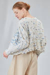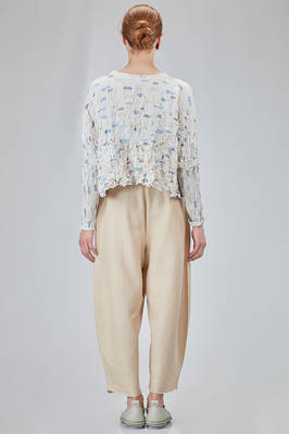 top corto e ampio in froissé di poliestere a righe diagonali alternate a righe garzate tono su tono e ritagli di cotone sparsi di diverse dimensioni e colori ad effetto pittura impressionista, girocollo con spacchetto laterale diagonale, manica lunga scesa asciutta al fondo, fondo stondato più lungo ai lati. Taglie francesi