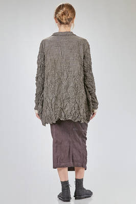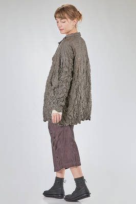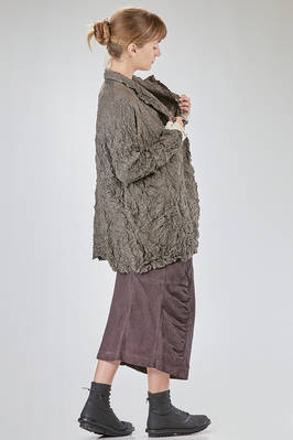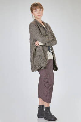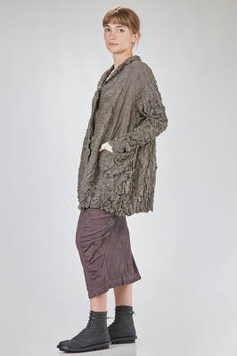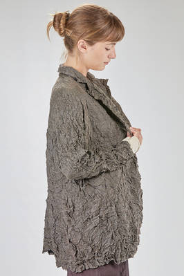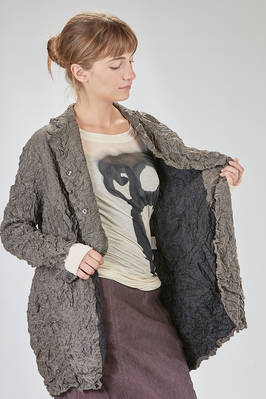 giacca lunga e morbida in froissé stropicciato di poliestere e lana melange, un petto con rever, chiusura con bottoni a pressione, fondo stondato, due taschini applicati al fondo sul davanti. La modella è alta cm. 167 e indossa una taglia francese 38