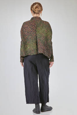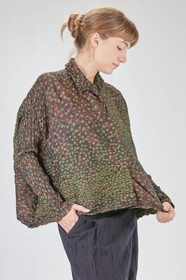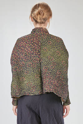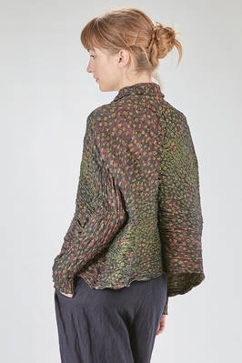 giacca/camicia al fianco, ampia, in froissé di poliestere orizzontale, con motivo shibori a cerchi irregolari, di diverse dimensioni e colori, collo a camicia, chiusura con bottoni a pressione, manica scesa più asciutta al fondo, due taschini applicati sul davanti. La modella è alta cm. 167 e indossa una taglia francese 38