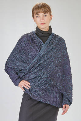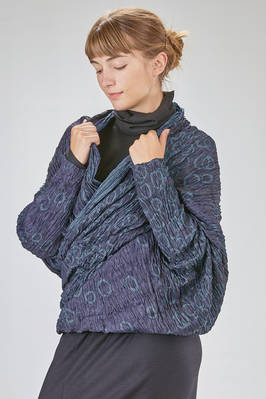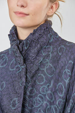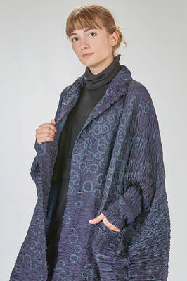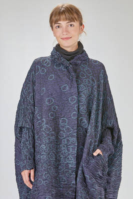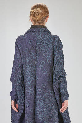 soprabito sotto al ginocchio, ampio, in froissé di poliestere orizzontale con motivo a cerchi irregolari e sovrapposti, un petto, collo a camicia, chiusura con bottoni a pressione, manica scesa e asciutta al fondo, due tasche applicate sul davanti. La modella è alta cm. 167 e indossa una taglia francese 38