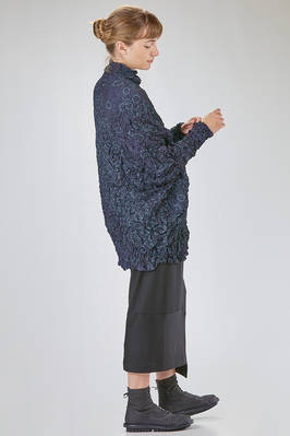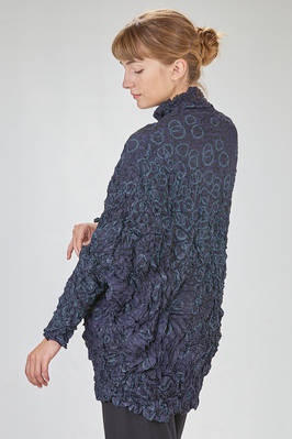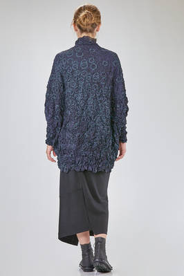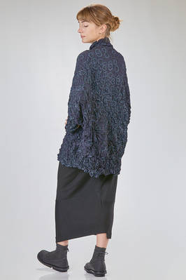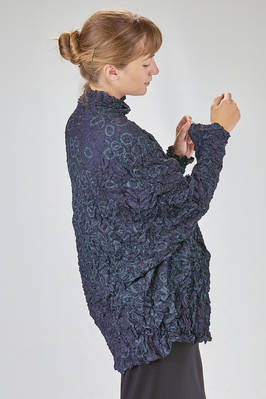 tunica lunga e ampia in froissé stropicciato di poliestere con cerchi irregolari ad effetto catenelle sparse di diverse misure, collo alto, manica lunga scesa più stretta al fondo, due taschini applicati al fondo, fondo più stretto. La modella è alta cm. 167 e indossa una taglia francese 38
