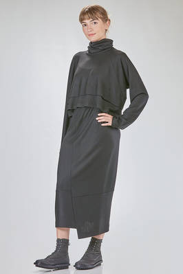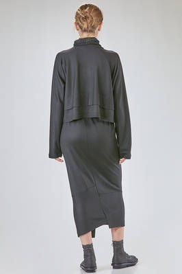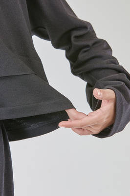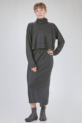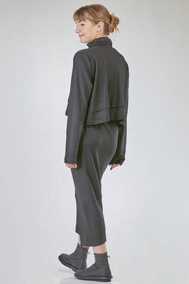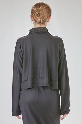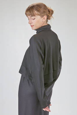 maglia corta e ampia in jersey di lana a mano morbida, collo alto morbido, manica lunga scesa, piega a balza rovesciata al fondo. La modella è alta cm. 167 e indossa una taglia francese 38