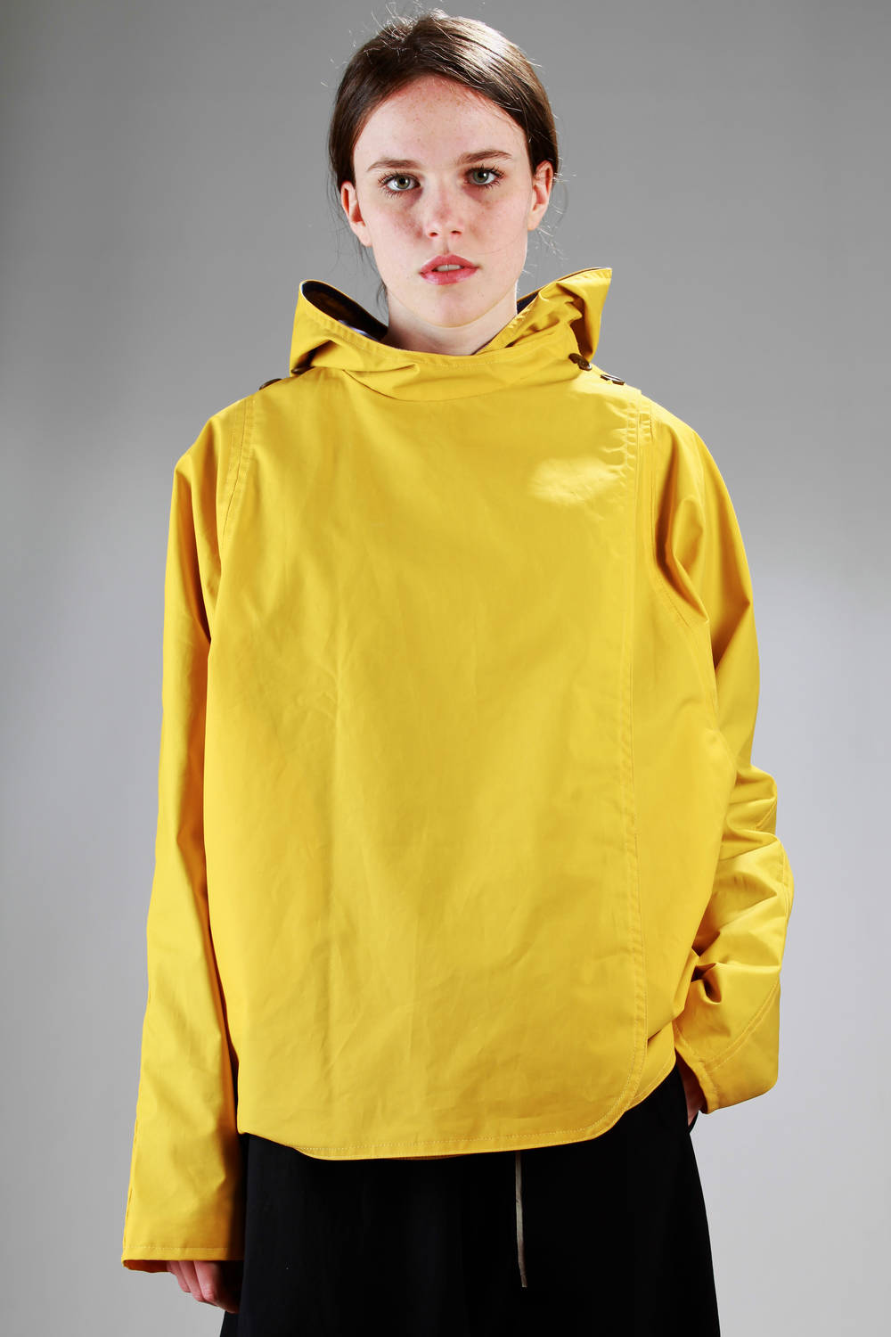 The pattern is serial, also in the sizing which is one size only: hood, central back dart, high diagonal welt pockets and a double-breasted closure, now identifying the label, with a couple of buttons from side to side that could be simply closed in the middle, giving to the garment the look halfway between the cape and the raincoat. This last attention is also aimed at letting emerge the patterns of the inner linings chosen for the current season. The creative exercise is in fact played around the chromatic choice of the cotton waterproofed with the most ancient and natural technique, the bee wax, and its matching with the inner canvas.