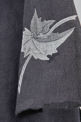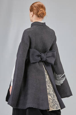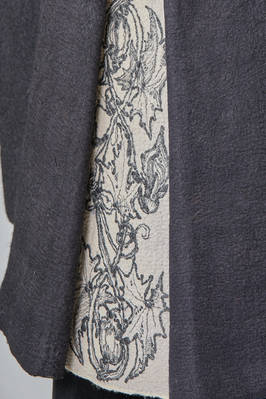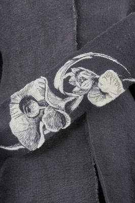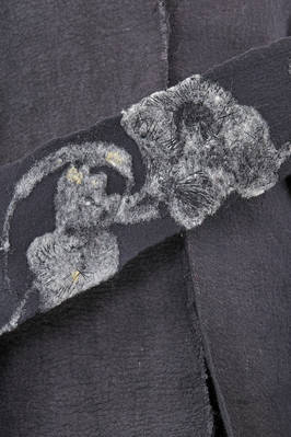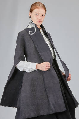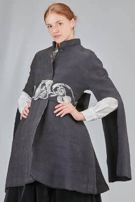 over the knee 'sculpture' coat in wool and silk nuno-felt with handwriting, embroidery and needlefelting technique, single breasted, band collar, closure with snap buttons and a band with floral motif, sleeves open on the inside, folder central back with contrasting color motif, leaf drawn on one sleeve, lean and flared line. It is a unique garment, entirely handmade, with organic and sustainable fibers