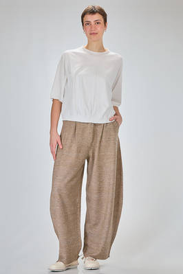 soft, hip-length t-shirt, in premium suvin cotton, very soft to the touch, crew neck, ¾ sleeves with ribbed cuff, raglan shoulder at the back, vertical seam at the front with dashed sunburst pattern, ribbed hem. The model is 180 cm. tall and wears a size M