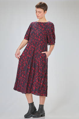 longuette dress, loose and fitted at the waist, made of silk and linen knit with flower-effect devoré inlays in contrasting colors and melange, wide round neckline, wide ¾-length rounded sleeves, vertical welt pockets on the sides. The model is 180 cm. tall and wears a size M