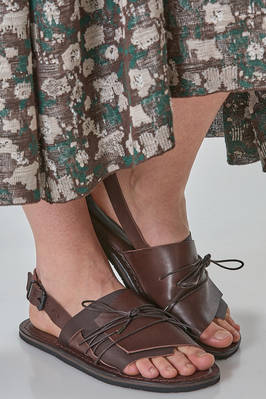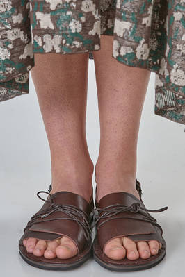 soft cowhide leather sandal with an overlapping flap layered over a moose leather flap, secured with braided laces tied over the instep, fastened with a fabric strap and a side buckle, low, rounded rubber sole. Model created in collaboration between Trippen and the Stuttgart based brand Pal Offner
