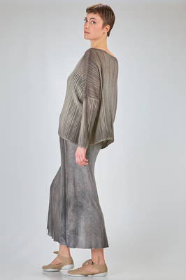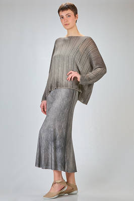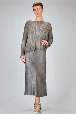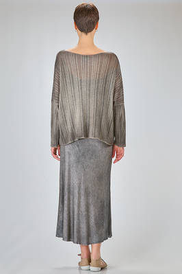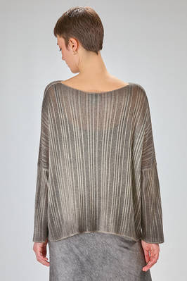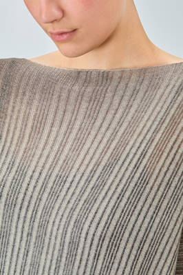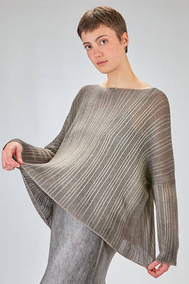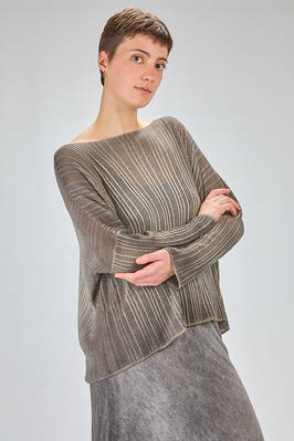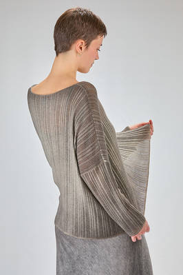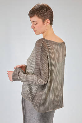 maglia al fianco, ampia, in maglia garzata con texture verticale tutta sfumata di cachemire sovratinto, ampio scollo a barchetta, manica lunga scesa. La modella è alta cm. 180 e indossa la taglia M