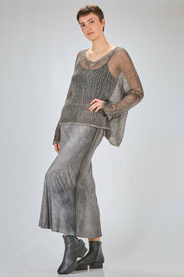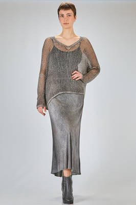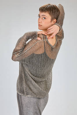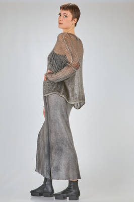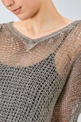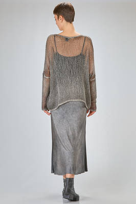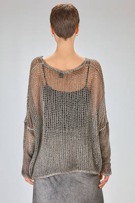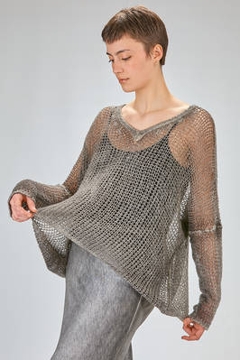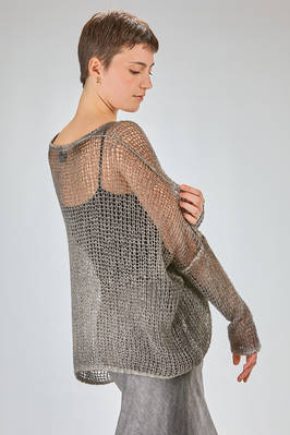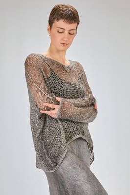 maglia al fianco, ampia, in maglia a rete larga di cachemire e seta tutta sfumata, ampio scollo a v, manica lunga scesa. La modella è alta cm. 180 e indossa la taglia M